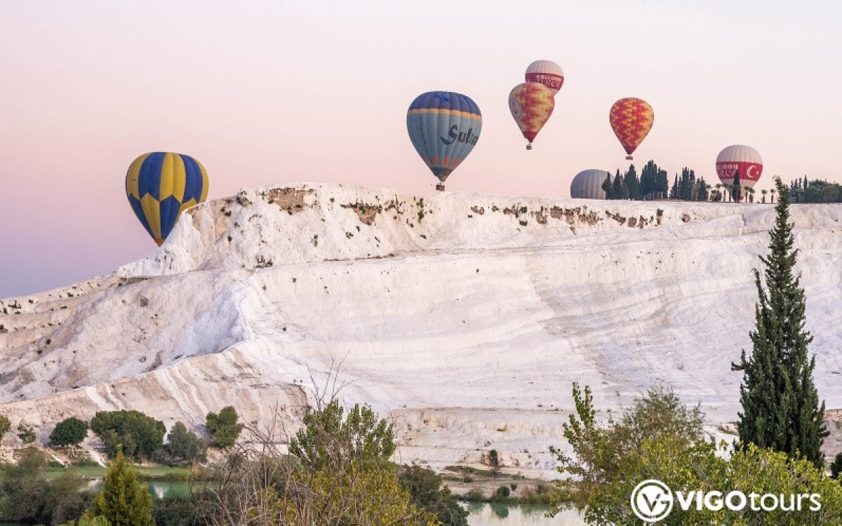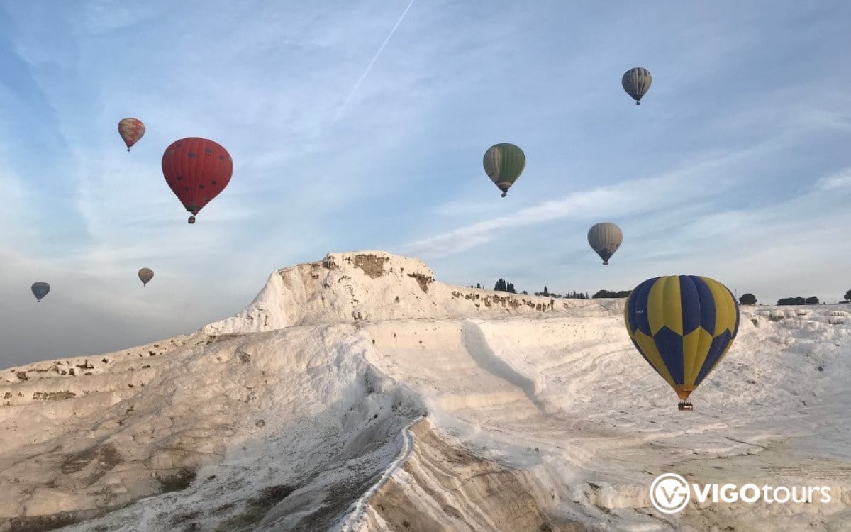 - Sunrise hot air balloon flight over the white travertines of Pamukkale
