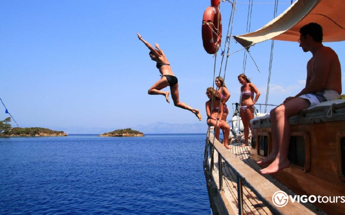 Die tägliche All-Inclusive-Bootstour in Marmaris — ist eine ganztägige Ausfahrt für alle, die Meer, Sonne und Natur in entspannter Atmosphäre genießen möchten. Entlang der wunderschönen Küste erwarten Sie Bade- und Fotostopps an sieben traumhaften Orten.
