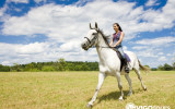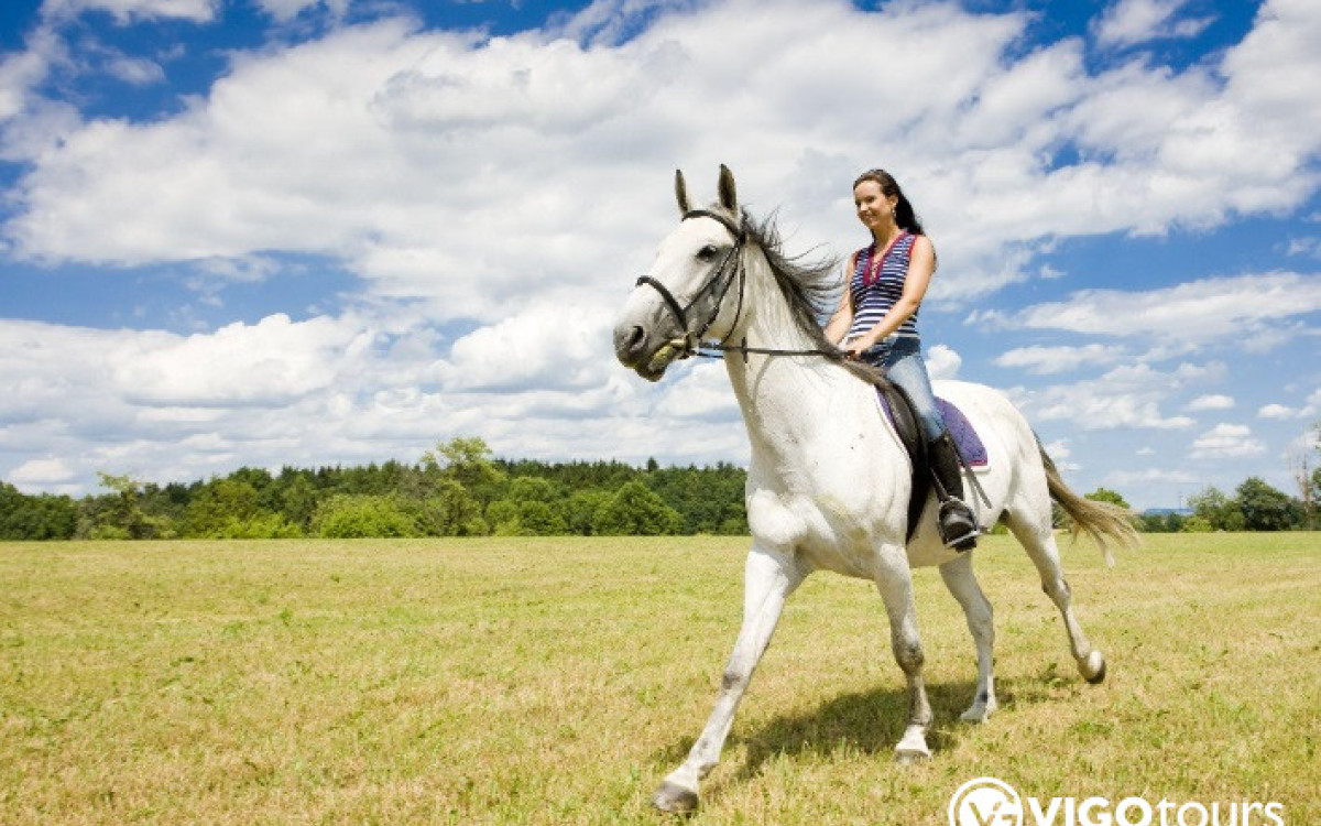 Comfortable clothing and closed shoes are recommended — helmets are provided by the horse farm.