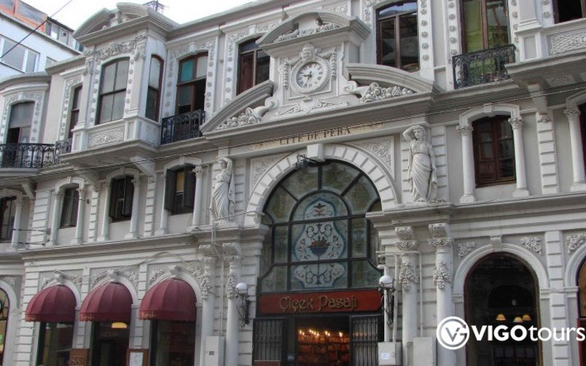 The next stop of our tour will be the Hagia Triada Eastern Orthodox Church, which means "Holy Trinity", the largest Greek Orthodox Church in Istanbul. Then we visit the Ağa Mosque, which was built in 1868. And after our visit to Ağa mosque, we will visit the historical Galatasaray High School, the oldest high school of the Ottoman Empire. It was built in 1481, and it was named "Galata Palace Enderun-u Hümayunu", which means Galata Palace Imperial School. After our historical high school visit, we will visit Cité de Péra (Çiçek Pasajı), one of the first theaters of the Ottoman Empire. This famous place is now a passage with many restaurants.