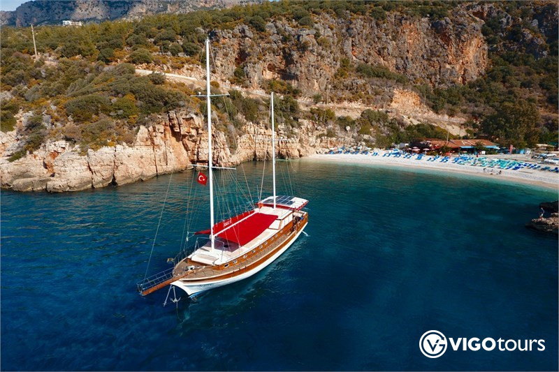 Dzisiaj popłyniemy na wyspy Yassica. Te małe wysepki nie mają indywidualnych nazw. Te wyspy są tak małe, że nikt ich nie nazwał. Największy z nich ma ładną piaszczystą plażę, a przy lagunie znajduje się mały przylądek basenowy. Następnie udamy się w spokojne i piękne okolice wysp Gocek, gdzie będziemy pływać, nurkować z rurką lub po prostu wygrzewać się na słońcu i cieszyć się piękną okolicą. Ostatnia przerwa na pływanie będzie na Czerwonej Wyspie i na noc w Fethiye.