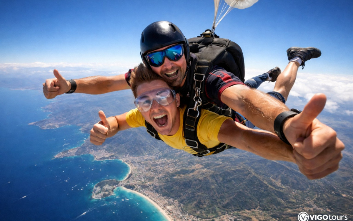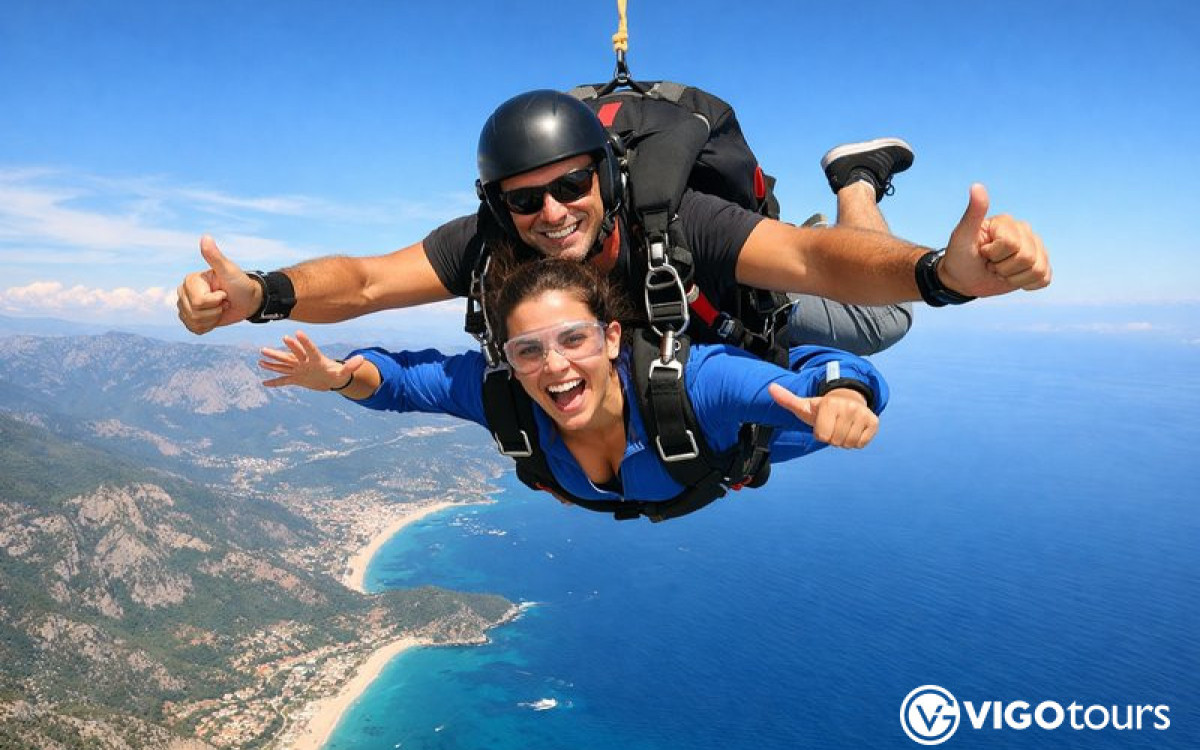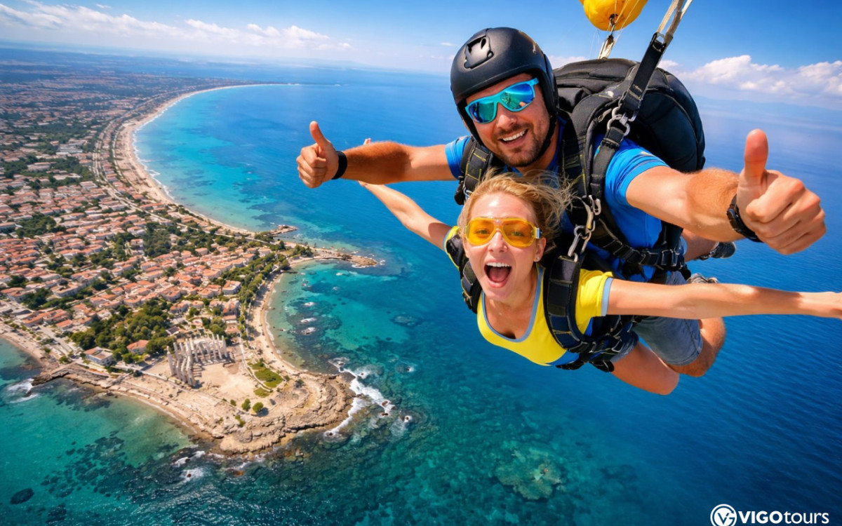 Feel pure adrenaline with a tandem skydiving experience over Side and Manavgat. Jump from 4,000 meters with a certified instructor and enjoy panoramic Mediterranean views. Professional photo and video recording is included.