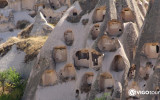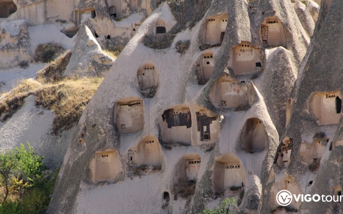 Güvercinlik Vadisi’nde verilen molada, vadi yamaçlarını süsleyen güvercin yuvalarının panoramik manzarası izlenir — bu yapılar geçmişte bağ ve tarım alanlarını gübrelemek için önemli bir rol oynamıştır.