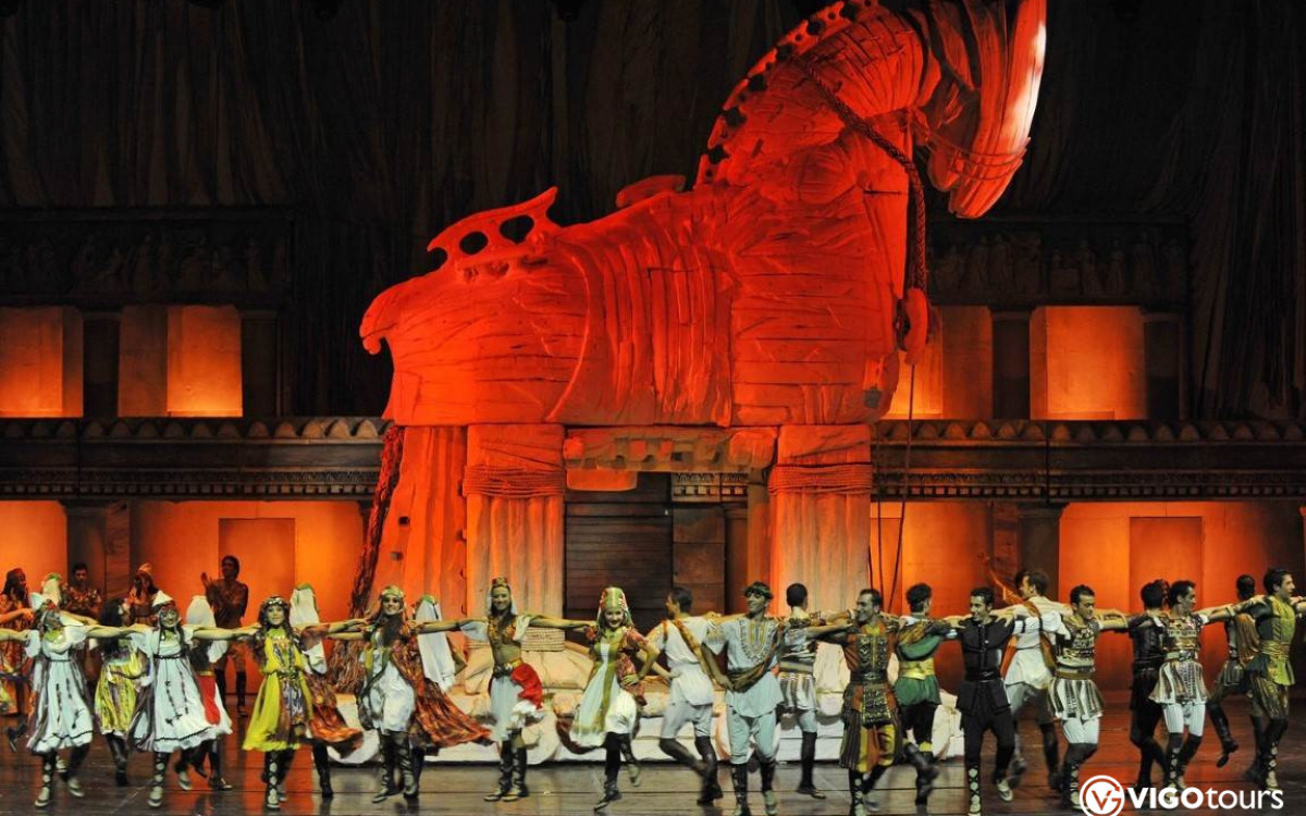 Kalabalık dansçı kadrosu, senkron hareketler, dramatik ışık kullanımı ve özel tasarlanmış kostümlerle Truva Savaşı’nı sahnede yeniden canlandırır.