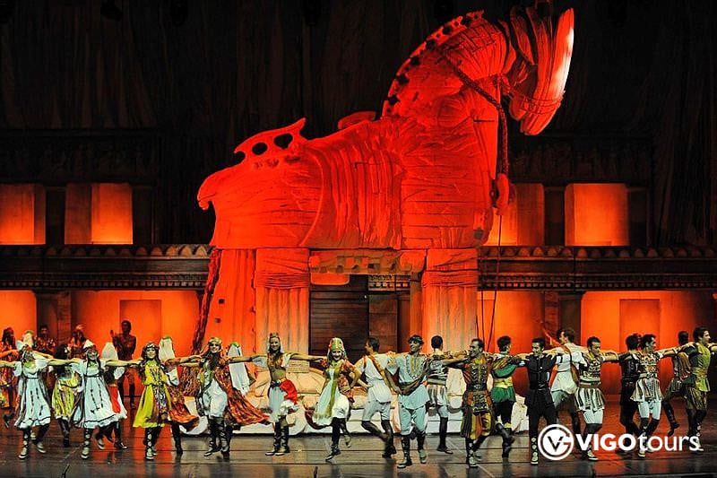 Yaklaşık iki saat süren gösteri, Truva mitolojisinden ilham alan sahnelerden oluşur.